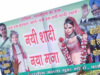 बृहस्पतिवार को कानपुर में एक पोस्टर दिखा, जिसमें एक तरफ श्रीप्रकाश जायसवाल सेहरा बांधे और दूसरी तरफ फिल्म अभिनेत्री राखी सावंत शादी के जोड़े में दिख रही थी। इस पोस्टर में लिखा था, नई शादी नया मजा।